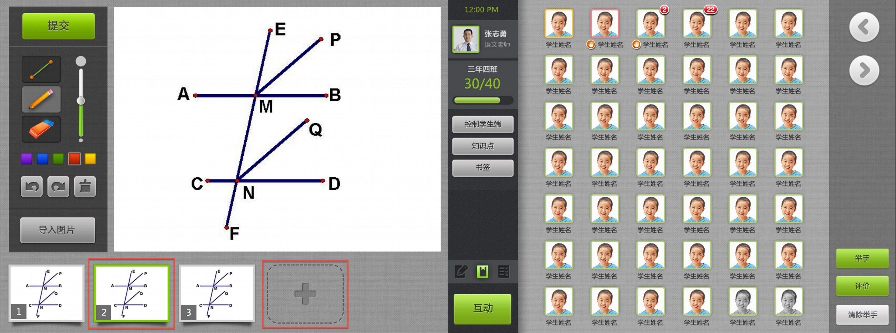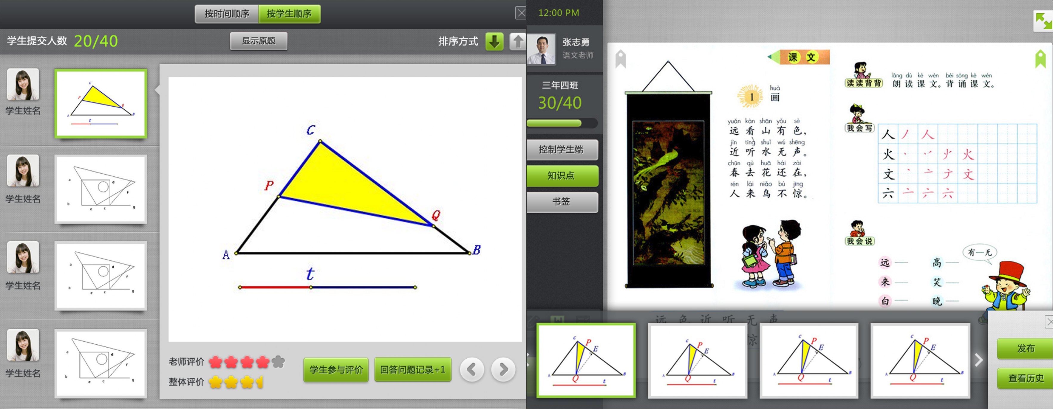 iPad分别安装教师端和学生端软件,登陆连接后教师可与学生进行教学互动。教师通过后台服务器的技术支持,将嵌入式教学资源应用到教师端对学生端的教学控制,实现协同教学功能。利用数字化教学工具针对知识点进行讲解和测验,以动态反馈辅助教师实时掌控学生课堂学习吸收率。