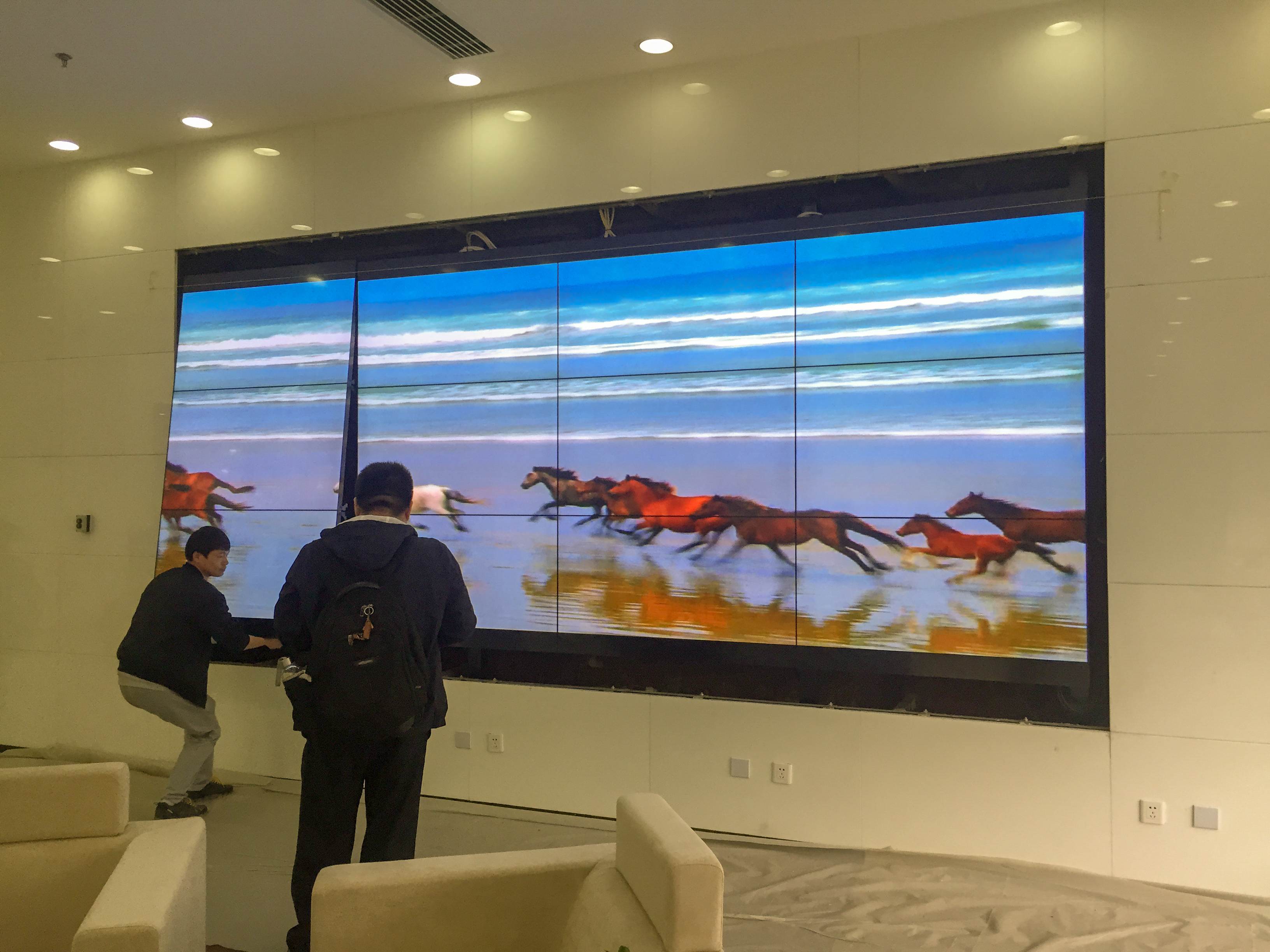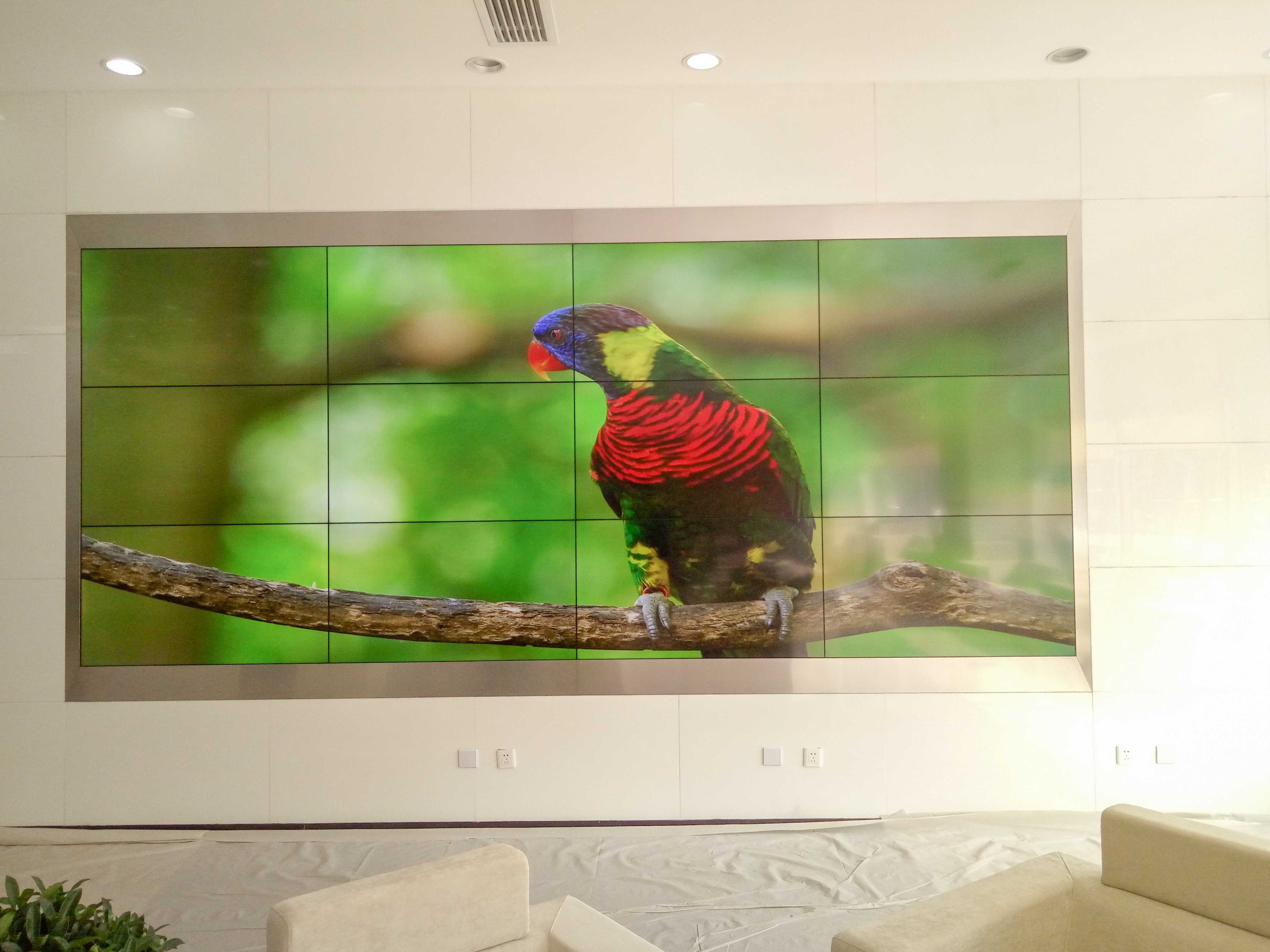 因业务扩充需要,社保中心新办公大楼新建一套大屏显示系统,要求在大理石贴面墙体的有限空间内安装液晶拼接屏,用于显示业务办理状态及宣传片等。