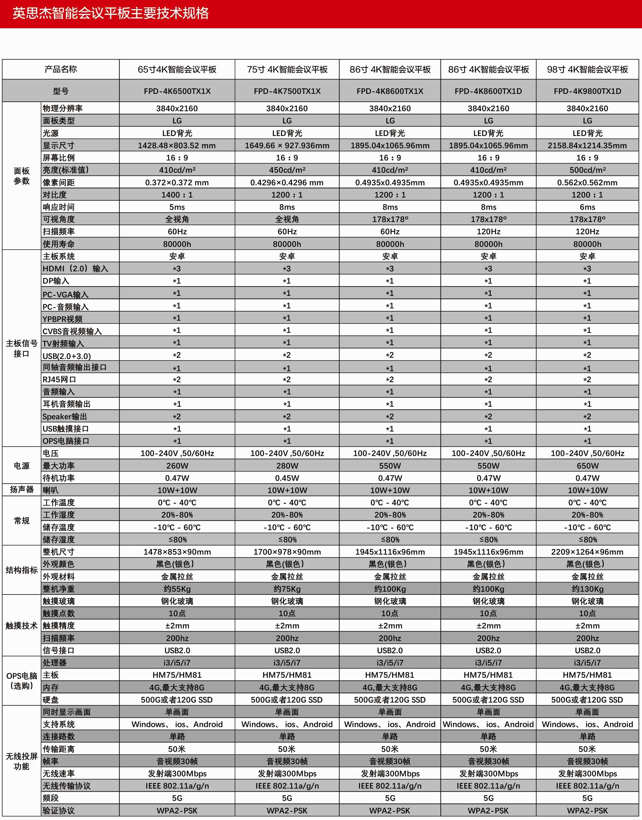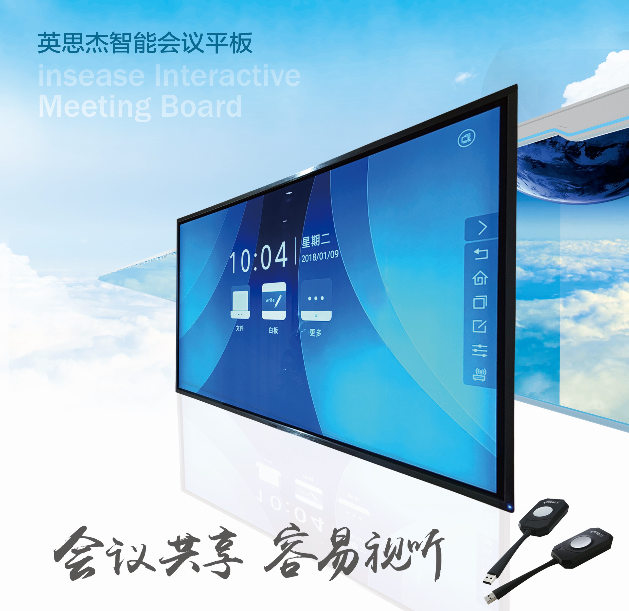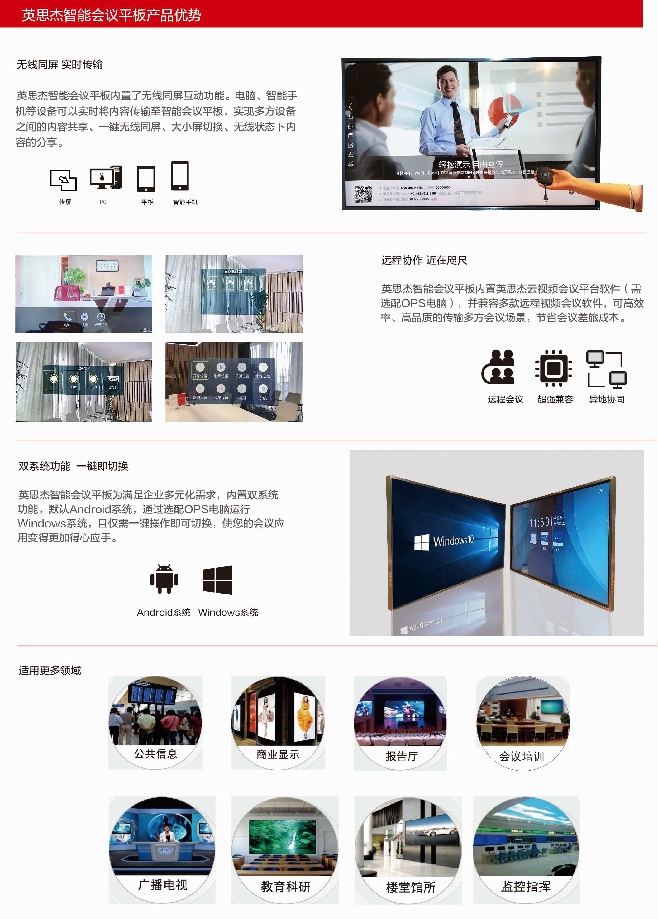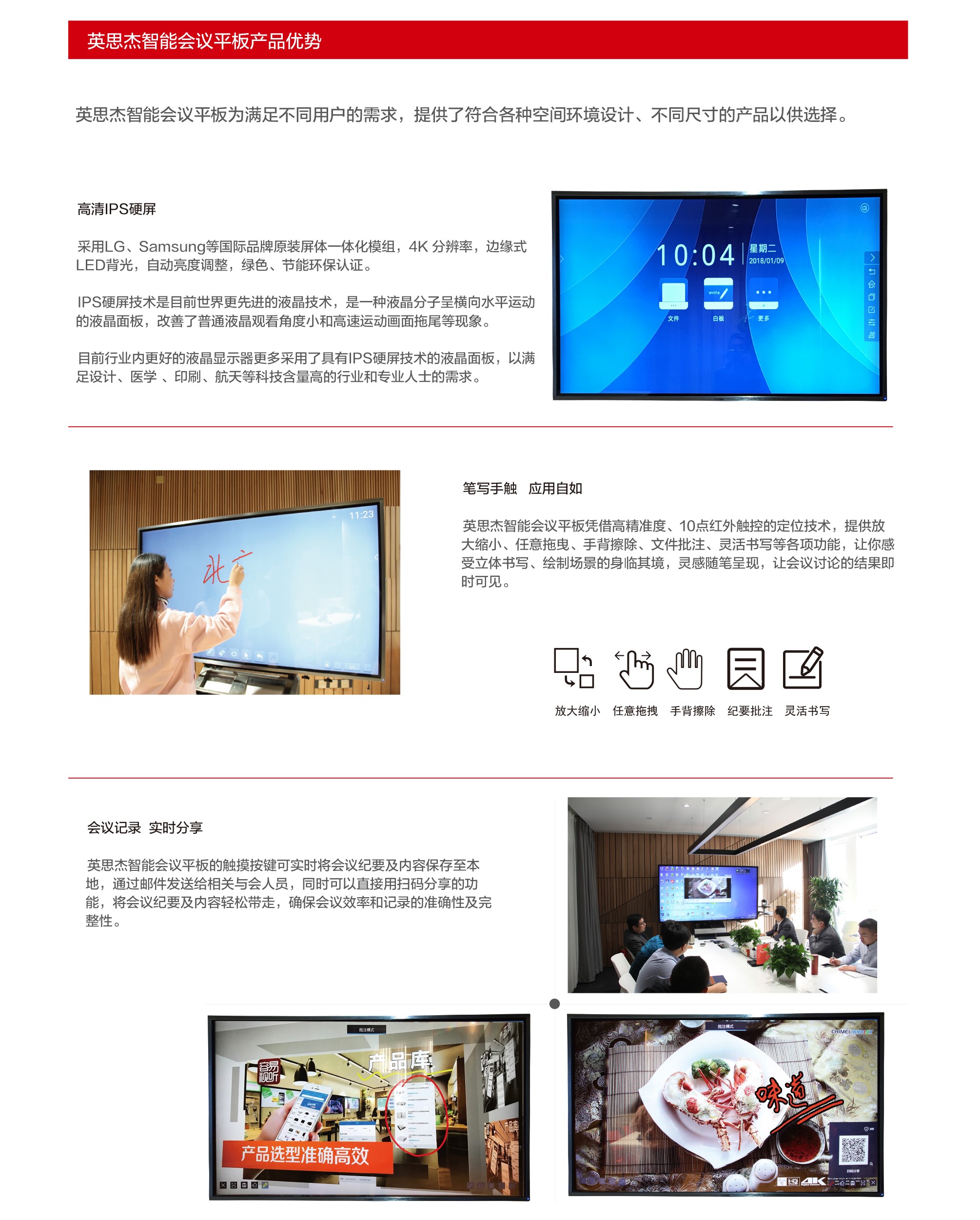 英思杰智能会议平板为满足不同用户的需求,提供了符合各种空间环境设计、不同尺寸的产品以供选择。适合用在:1:高清IPS硬屏 2:笔写手触 应用自如 3:会议记录 实时分享 4:无线同屏 实时传输 5:远程协作 近在咫尺 6:双系统功能 一键即切换 7:适用更多领域 :公共信息、商业显示、报告厅、会议培训、广播电视、教育科研、楼堂馆所、监控指挥等场合