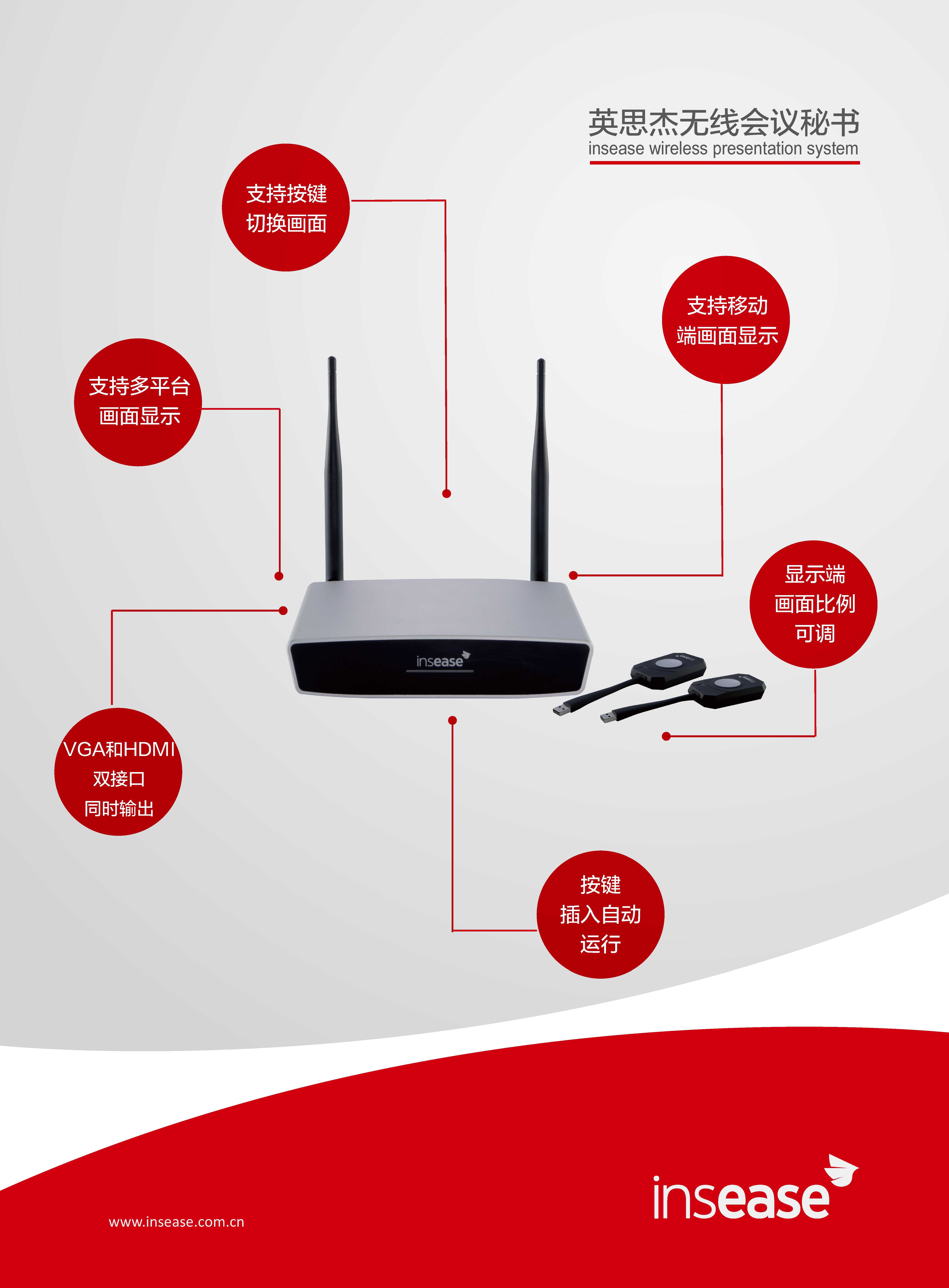 无线传输技术给人们工作带来的便利已无处不在,不仅仅是无线键盘、鼠标等配件,如何利用无线传输技术改善工作体验,提高工作效率,一直是科技研发的风向标。本着“easy”的操作理念,insease推出“一键双屏”无线会议秘书。