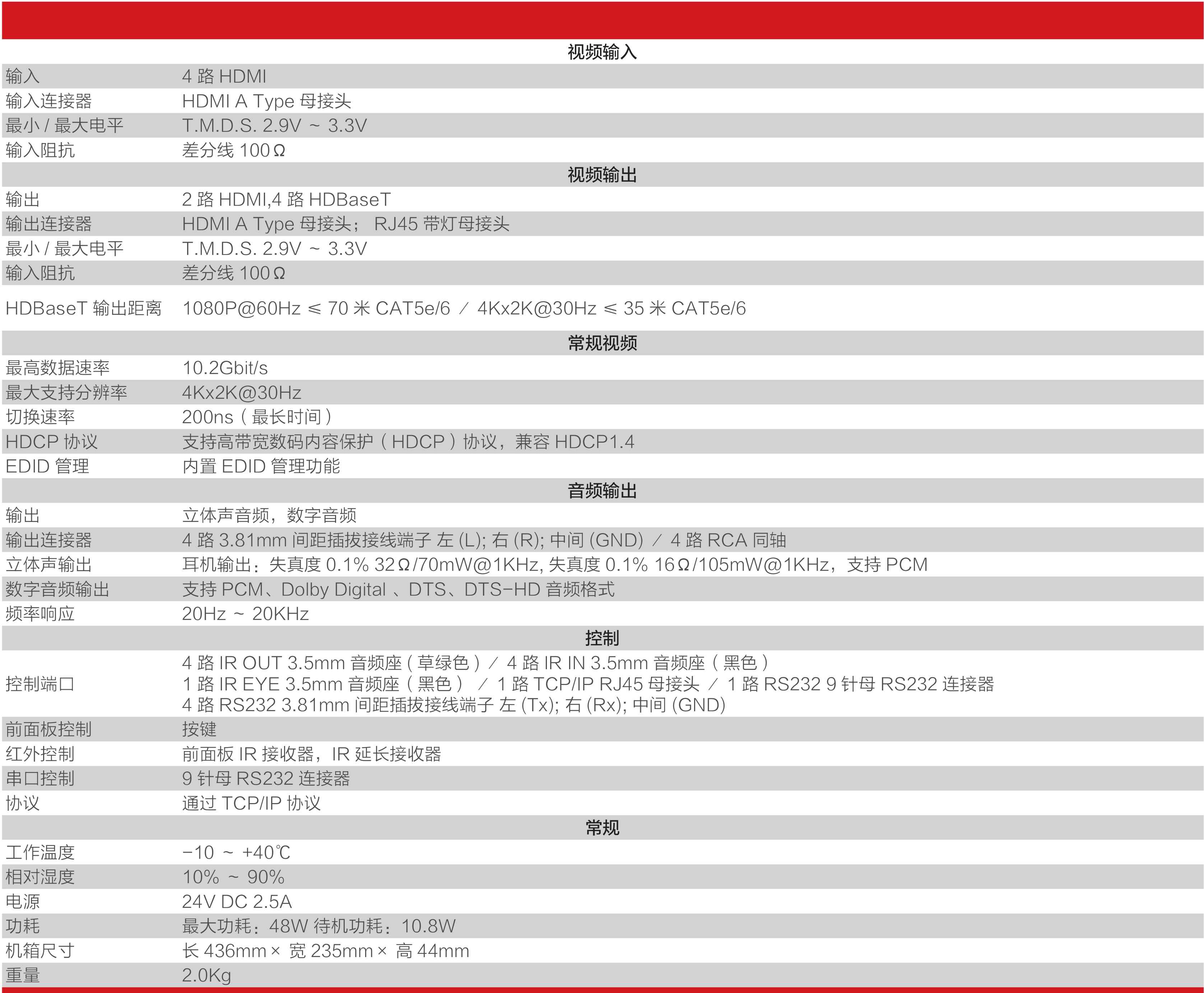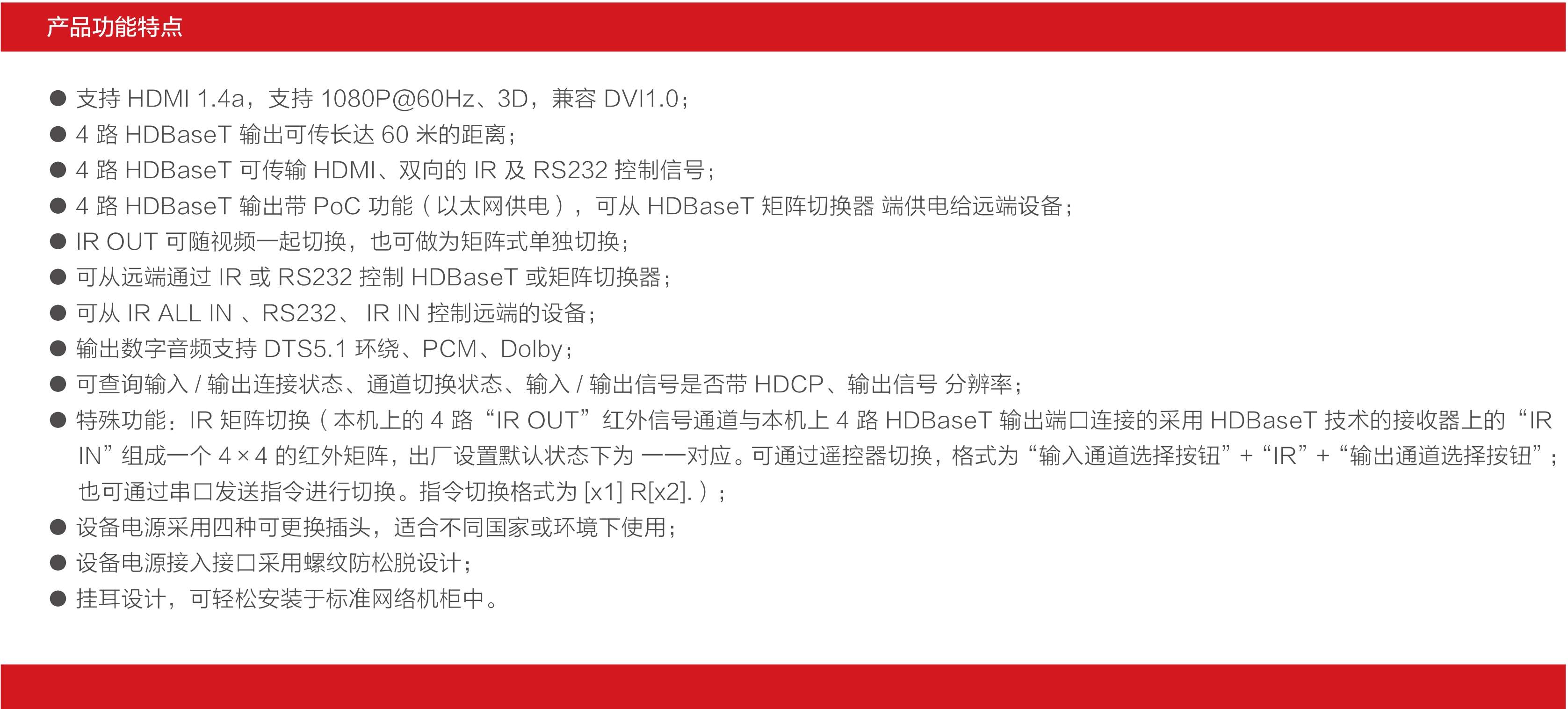 HDBT-4x4矩阵是一款集成HDBaseT技术的矩阵切换器,支持的输入信号有:4路HDMI 视频信号、4路红外信号。支持的输出信号有:4路HDBaseT视频信号、2路本地HDMI视频信号、4路红外信号、4路数字音频信号、4路模拟音频信号;支持分辨率为4Kx2K视频信号;HDBaseT端口支持PoC功能。支持HDMI1.4标准,兼容HDCP2.2标准,分辨率最高支持4Kx2K视频信号,音频输入输出口均可通过指令选择内嵌音频或外接音频。本产品功能齐全:4x4矩阵切换、强大的EDID管理功能、多样式IR、RS232通讯控制、HDBaseT端口PoC远程供电功能等。产品控制方式多样灵活,可通过配套遥控器控制、前面板按键控制、红外控制、指令控制、GUI图形用户界面控制。主要应用于会议室集成或者酒店宴会厅等。