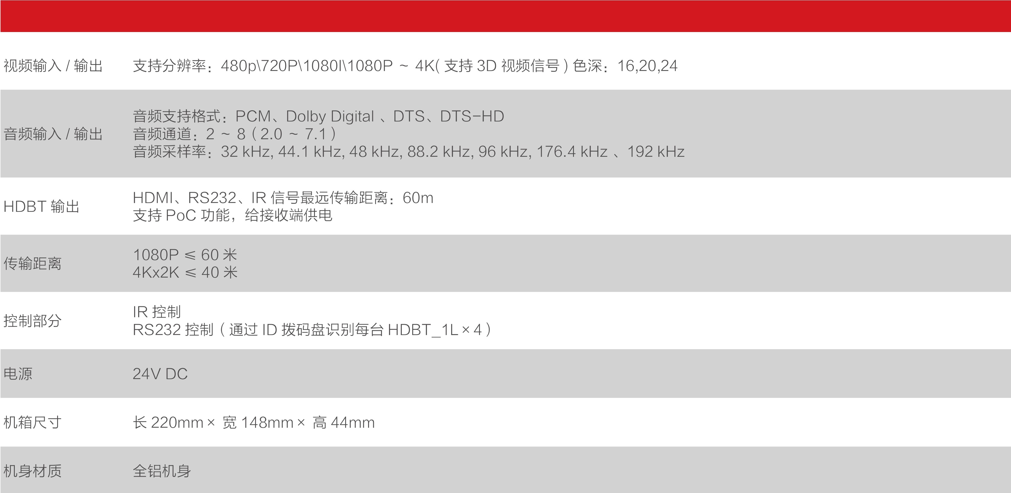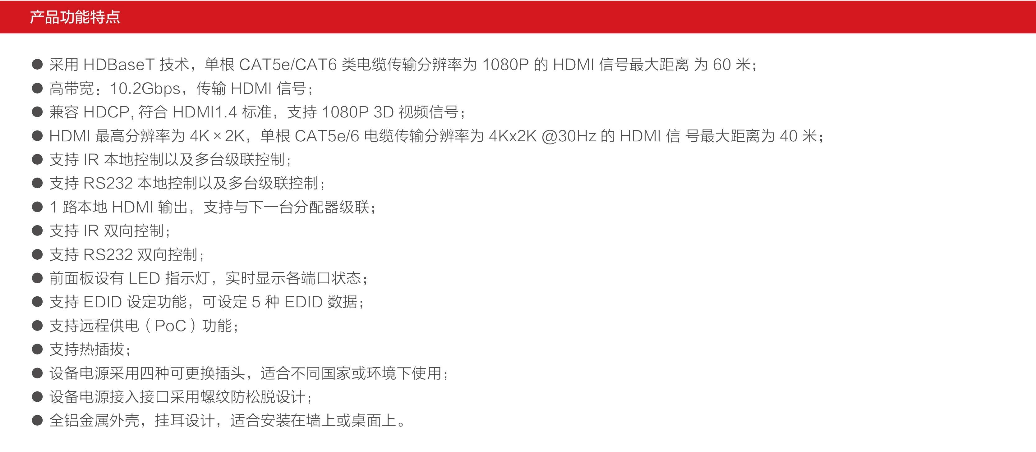 HDBT-1L×4分配器是一款商用的4K×2K HDBaseT 1x4分配器,将一路HDMI信号分配成四路一致的 HDBaseT信号输出。具有一路HDMI输入,一路HDMI输出,HDMI输出可以作为本地输出或者与下一个分配器级联,同时还有四路HDBaseT输出。可以同时传输HDMI,IR,RS232信号,HDMI 最高分辨率可达4K×2K,适用于信号远距离传输,最远输出距离可达60米。HDBT_1L×4分配器可以实现 IR(双向)、RS232通信功能,具有EDID数据设定功能以及远程供电功能(PoC)。主要应用于各种会议室集成。